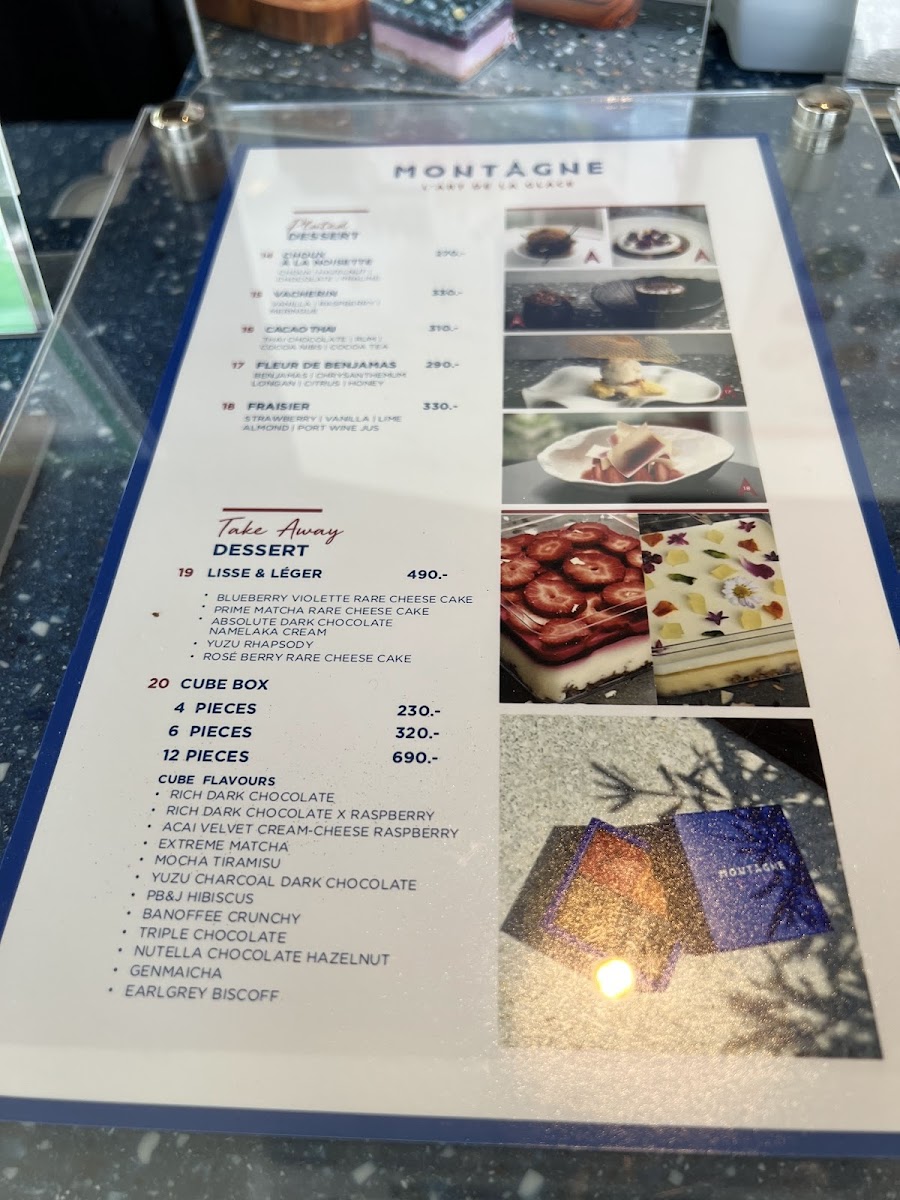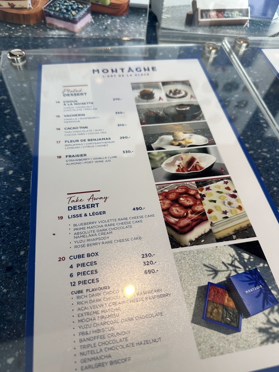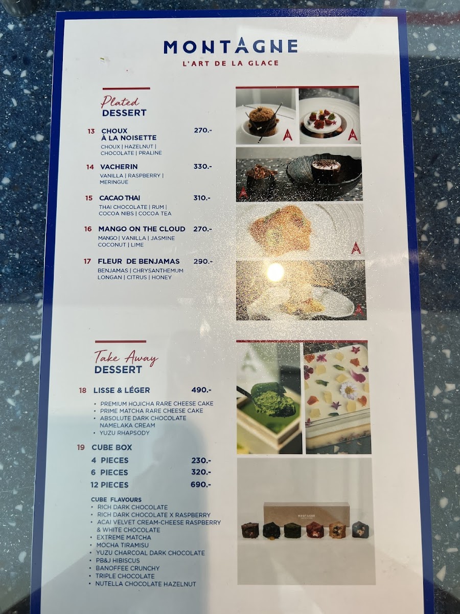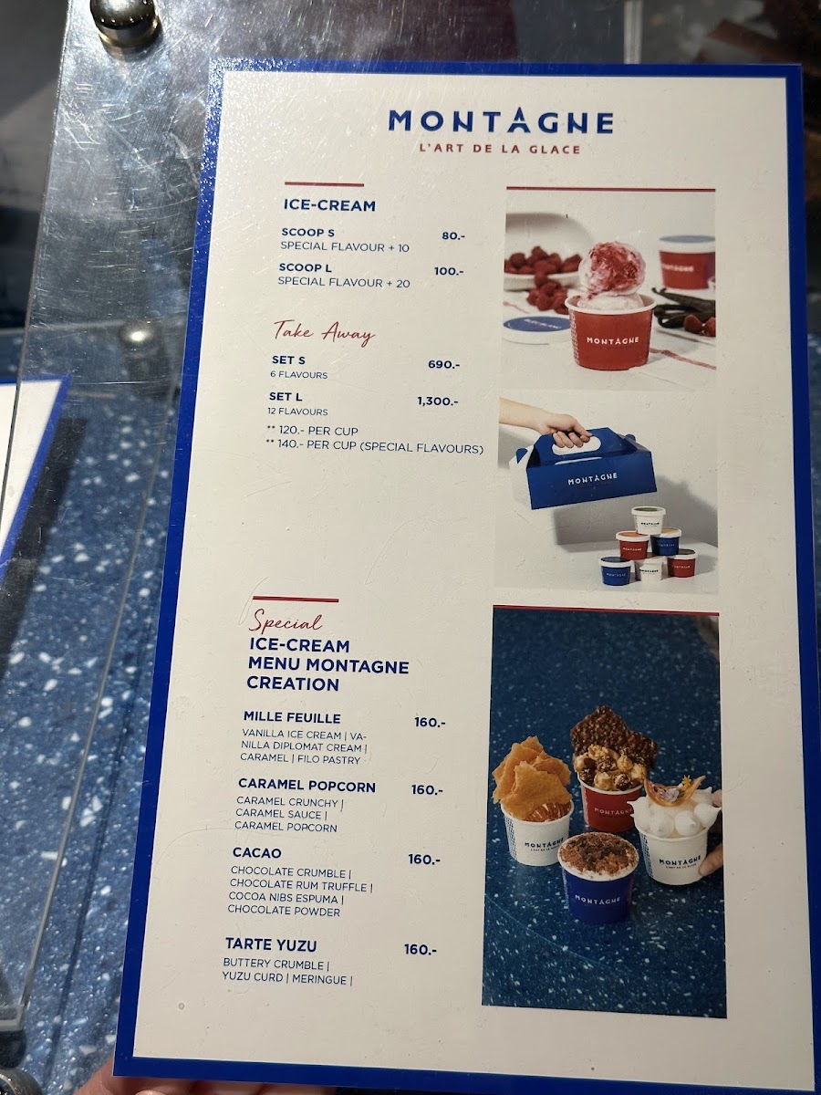Montagne L'art de la glace is a charming ice cream shop and patisserie nestled in Bangkok’s Bang Kho Laem district. Though small and cozy, it crafts an impressive menu that stands out for its artisanal gelato and exquisite cakes. The shop’s unique flavors, like the rich Samurai dark chocolate with whisky and the refreshing Mangosteen sorbet, showcase a masterful balance of boldness and delicacy. Signature treats such as the Malt Granola ice cream, with its creamy texture topped generously with granola, and the creative Cube Box, featuring cookie crust cubes filled with varied sauces, illustrate their inventive approach to dessert.